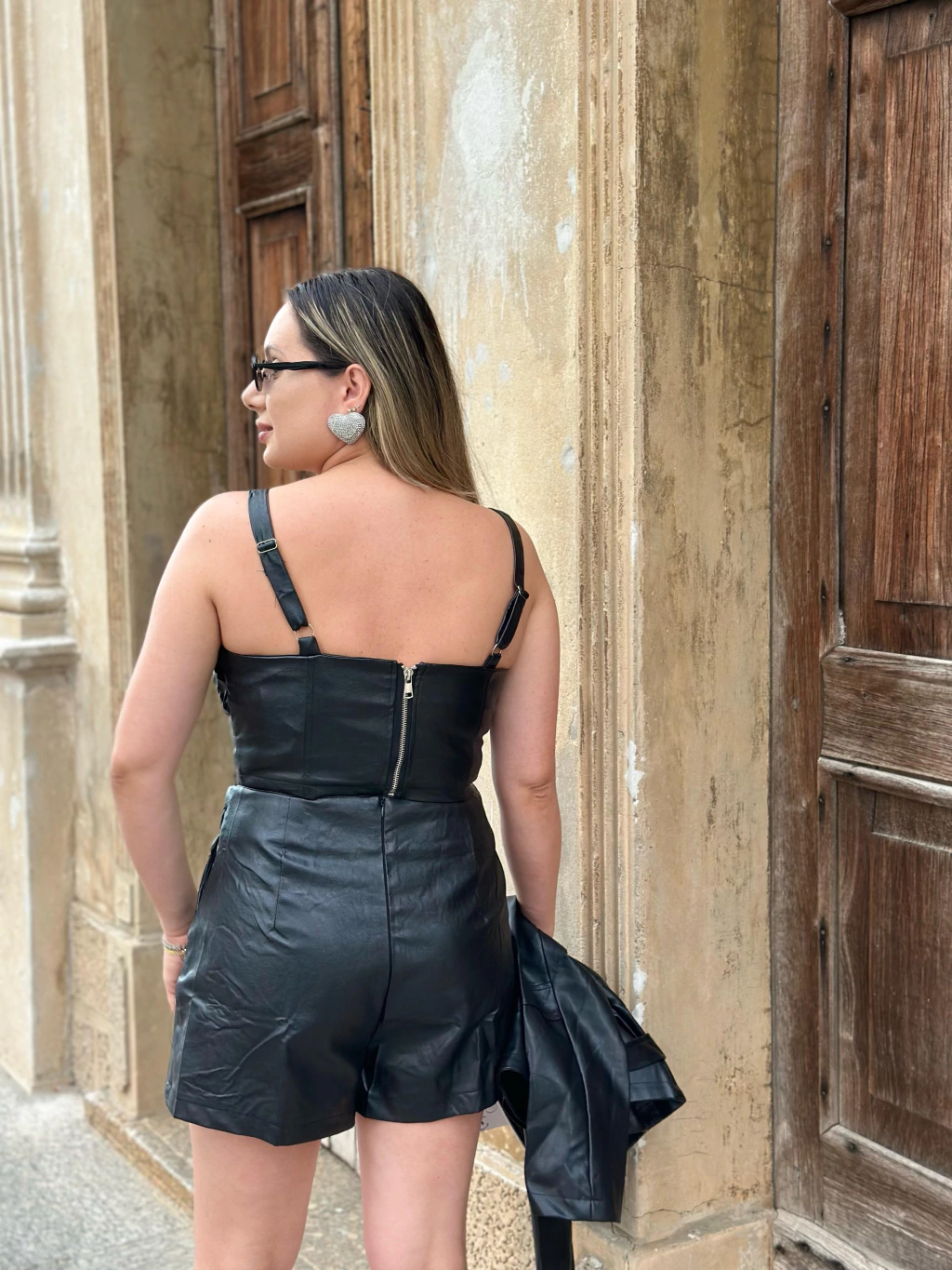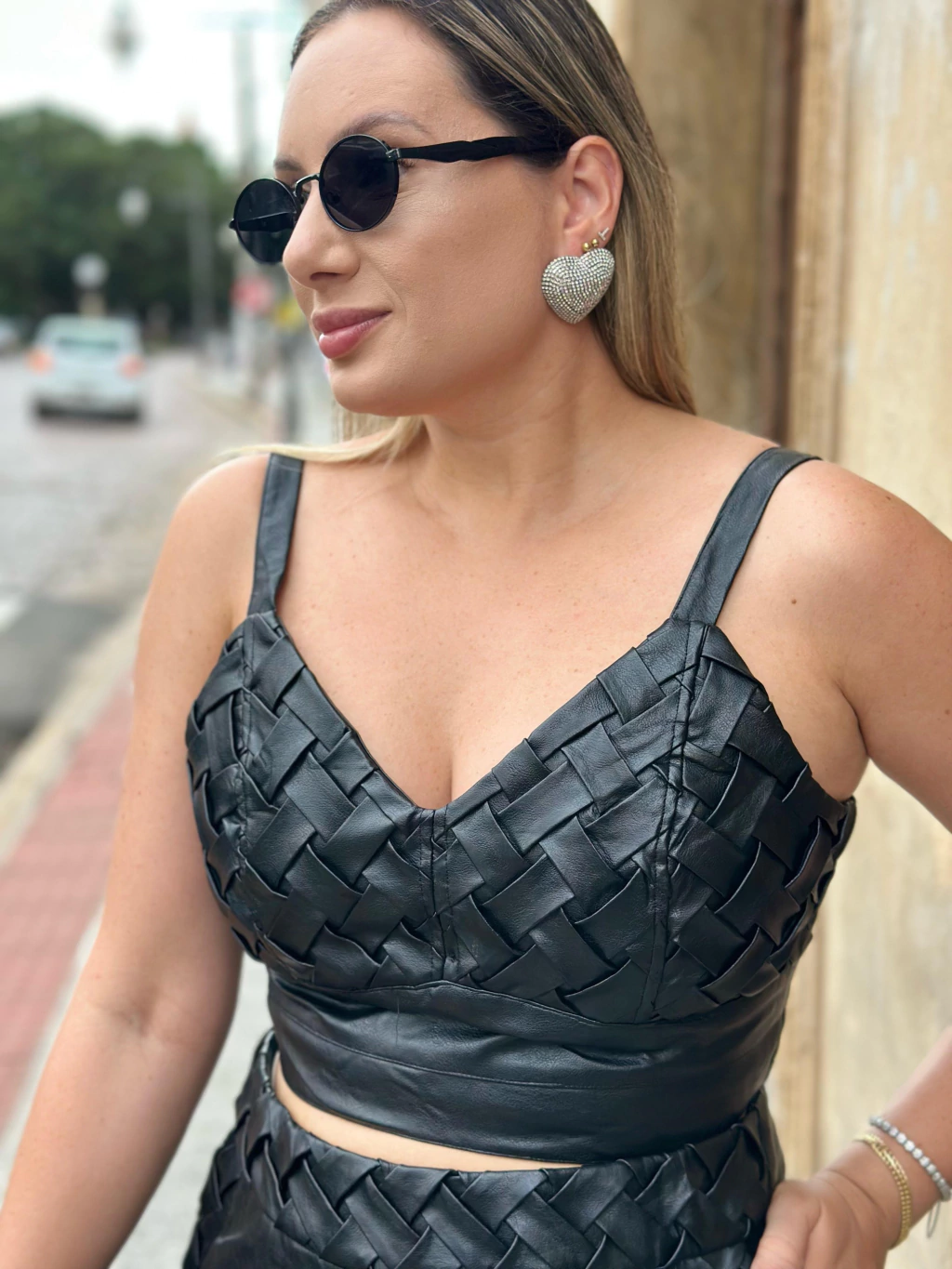 Cropped contém alça com regulagem e zíper na parte de de trás;